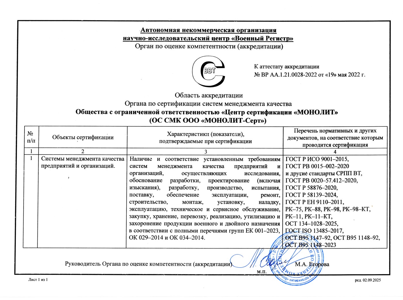 В 2002 году орган по сертификации ООО «МОНОЛИТ-Серт» был аккредитован в СДС «Военный Регистр» в качестве органа по сертификации систем менеджмента качества и в настоящее время имеет свидетельство о регистрации № ВР СР.1.21.0704-2022 и аттестат аккредитации № ВР АА.1.21.0028-2022 со сроком действия по 18 мая 2027 года. Орган по сертификации ООО «МОНОЛИТ-Серт» имеет Лицензию рег. №36668 от 09.12.2021 на проведение работ, связанных с использованием сведений, составляющих государственную тайну, со сроком действия до 11 августа 2026 года.